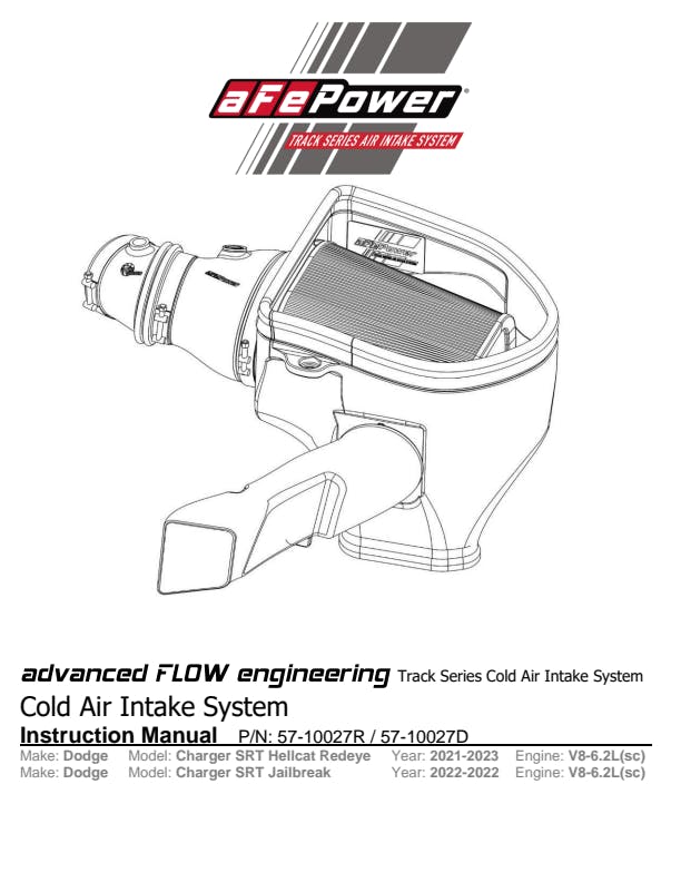 This 10” tall 360-degree radial flow air filter features our oil-free Pro DRY S media with three layers of synthetic media for maximum convenience. Its progressive layering provides great filtration efficiency and dust holding capacity, while not requiring the use of oils. This media is best suited for street use.. This Track Series air filter was specially designed for the Redeye and features a carbon fiber top. A 100% high gloss twill weave carbon fiber intake tube is used achieve maximum power gains while maintaining a perfect fit and reducing weight. The included massive air filter is surrounded by an open-element XLPE (cross-linked polyethylene) polymer housing that minimizes warm engine air for maximum performance. Its open design allows for easy viewing of the massive air filter, yet seals to the hood to gather air from the factory hood scoop. The housing also connects to the factory front grille air inlet thanks to the scoop inlet provided. This is a direct fit intake system that utilizes factory mounting points. All necessary T-bolt clamps, a silicone bellows coupling, and all other hardware is included. For the SRT Hellcat Redeye, the factory MUA (Multi-Air Unit Actuator) is easily connected to the air intake tube. All clamps and hose are provided to guarantee correct crankcase flow, avoiding check engine lights and damaging factory hoses and sensors. The removal of the factory scoop and installation of the aFe POWER scoop requires the removal of the front bumper. This installation will take around 2 hours and is recommended to be performed by a professional.