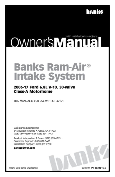 Remove airflow restrictions with complete intake and exhaust system plus advanced programming. Gain up to +56 hp and +70 lb-ft. 7 Percent more MPG. Chrome tip. Does not include AutoMind. Here's a major dose of new RV power without the new RV price! PowerPack delivers 26% more horsepower and torque to your V-10: up to +56 hp and +70 lb-ft at the rear wheels. Rockets you up 6% grades 12% faster and chops three seconds off your 0-60 mph time. With PowerPack's engineered intake and exhaust upgrades plus calibrated fuel tuning (optional), your rig will pass and merge a whole lot easier and more safely - and you'll get up to 7% more MPG , too! US Patent #6,634,171 B1 Please note: Fits all Fleetwood and National RVs except 2004 and up Powerplatform and Duraframe models. Includes: Ram-Air Cold-Air Intake System, Ram-Air Oiled Filter, TorqueTube Exhaust Manifold System, Monster Exhaust System, Extension Pipe, Chrome Tailpipe, Heatshield, Banks Power Urocal, CARB Decal, Includes all necessary hardware. Key Features: Removes airflow restrictions with complete intake and exhaust system. Optimizes airflow, air density, continuous power & MPG. Honors the host vehicle & improves longevity. Gain up to +56 hp and +70 lb-ft. 7% more MPG. CHROME tip