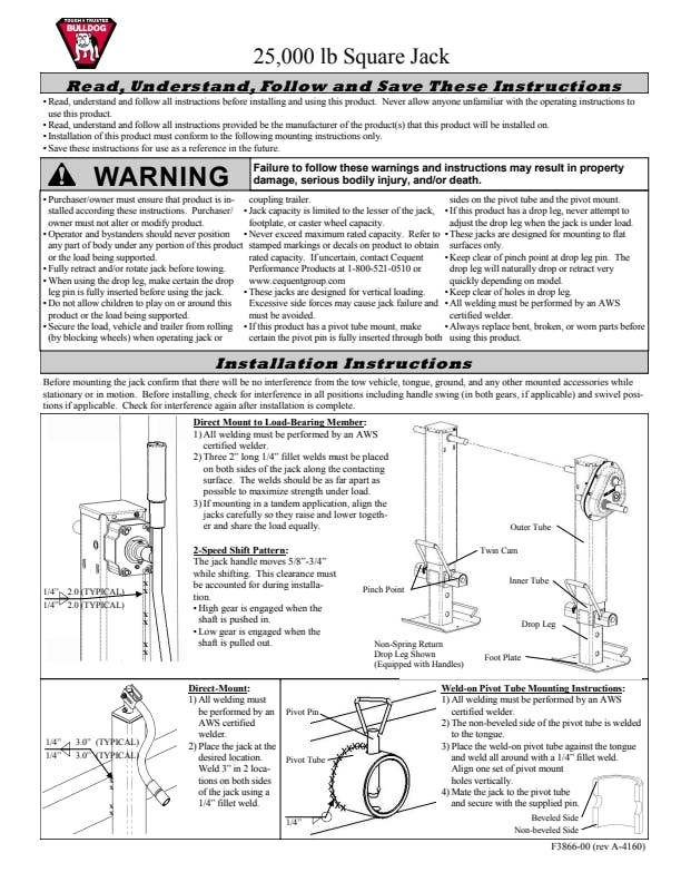 Twin Cam HD Trailer Jack; Sidewind; 25000 lbs. Static; 12500 lbs. Lift; Non-Spring Return; 12 1/2 in. Of Travel; 13 1/2 in. Drop Leg Extension; Crank Sold Separately;