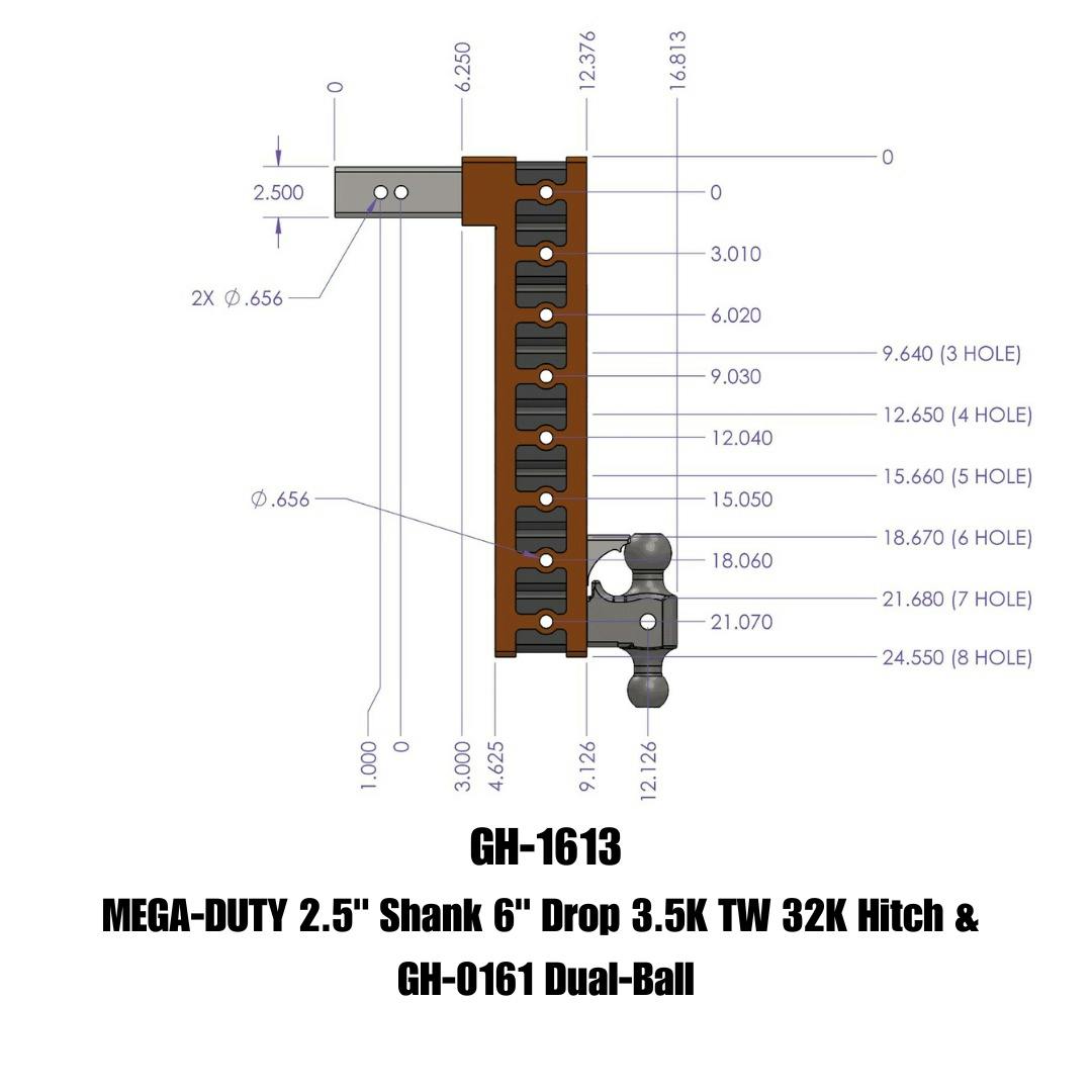 MEGA-DUTY 2.5" Shank 6" Drop 3.5K TW 32K Hitch & GH-0161 Dual-Ball