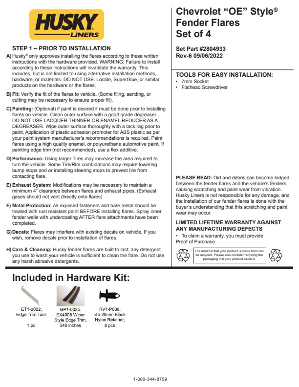 - OE Style fender flares are covered by Husky Liners Limited Lifetime Warranty. Featuring Husky's legendary durability, so they're built to last. Proudly made in the USA with global materials.