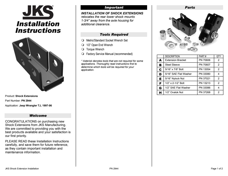 Extend the rear shock mounts on your Jeep Wrangler TJ or LJ with a JKS Lower Shock Extension Brackets. The design eliminates interference between your Jeep's shocks and the axle housing. The heavy duty design protects shocks from damage and prevents catastrophic shock mount failure. Compensates for rotation of axle housing when CV-type driveshaft has been installed. Durable powder coated finish provides excellent corrosion resistance. Easy, bolt-on installation requires no modifications.