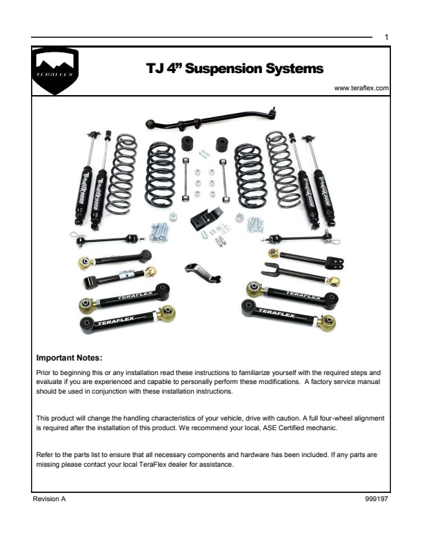 4" Lift Coil Springs (Front: # 1843402 & Rear: # 1844402), Rear Track Bar Axle Bracket Kit (3-6" Lift) (# 1944000), Drop Pitman Arm (3.5-6" Lift) (# 1922133), 2.25" Front Lower Bump Stop Extension Kit (3-4" Lift) (# 1910234), 2.25" Rear Upper Bump Stop Extension Kit (4" Lift) (# 1910204), 10.5 in. Rear Sway Bar Link Kit (2.5-5 in. Lift) (# 1944011), 2003-2006 TJ: 1" Transfer Case Lowering Spacer Kit (# 1900103), All necessary hardware, And more |