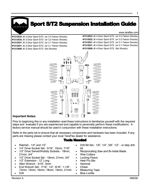 These all-inclusive TeraFlex Sport ST (Street & Trail) Suspensions Systems deliver true street & trail (ST) performance and capability in a dependable and maintenance-free package. Developed for the Jeep enthusiast looking for highway stability and trail performance in a no-compromise package, the 2.5" Sport ST2 Suspension System adds preset front lower Sport Control Arms, an HD Forged Adjustable Front Track Bar, rear track bar bracket, and more. The additional ground clearance allows for fitment of larger diameter tires with excellent on- and off-road manners. All Sport ST Suspension Systems feature lift coil springs, bump stops, and front sway bar quick disconnects optimized for stated lift height. Sport ST2 and Sport ST3 Suspension Systems add preset Sport Control Arms (2.5"+: front lower; 3": rear upper, rear lower) to balance caster and pinion angles as well as optimize rear pinion angles, anti-squat geometry, and tire position. These systems also include our HD Forged Adjustable Front Track Bar and rear track bar bracket, which improve steering response, center the axles to optimize vehicle roll center, and reduce body roll for unsurpassed handling. This results in a simple ?install and drive" bolt-on installation with no cutting or welding required. These maintenance-free suspension systems provide superior on-road ride quality and comfort with maximum off-road flex. TeraFlex suspension systems provide reduced noise, vibration, and harshness (NVH). Sport ST Suspension Systems can be installed on Friday, wheeled on Saturday, and driven to church on Sunday! Does NOT include shocks. We recommend Falcon Performance Shocks. Falcon shock absorbers and TeraFlex lift coil springs have been engineered together to improve both compression and rebound for optimal vehicle stability. Sport ST2 Suspension Systems are offered with Falcon Series 2.1 Monotube Shocks or without shock absorbers.
