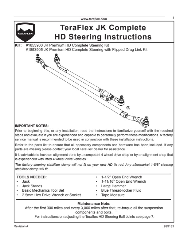 The TeraFlex JK: HD Forged Drag Link Flip Kit & HD Chromoly Tie Rod Kit withstands extreme conditions and abuse that typically causes factory steering components to bend and fail on lifted JK Wrangler/Unlimited models. ?Flipping" the HD Forged Drag Link (50% stiffer than factory) over the Knuckle helps eliminate front-end shimmy and other alignment issues. The axle end joint is flipped 180 degrees so it can be pressed down into the top of the knuckle.