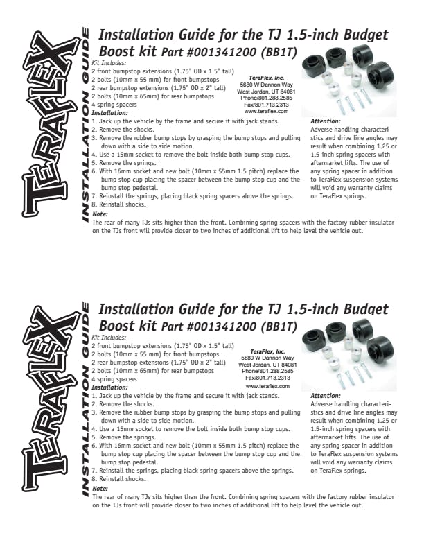 Use these 2" TeraFlex TJ: Coil Spring Spacers to level out a loaded vehicle. Compatible with stock height or lifted vehicles. Fits front or rear coil springs. Sold individually Spacer measures 2.0" and will provide 1.5" of lift if the factory spring isolator is NOT used.