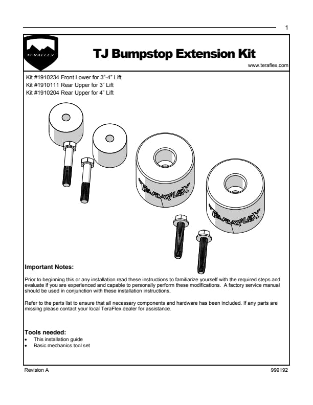 Proper bump stop length and/or bump stop strike pad height is crucial for preventing damage to suspension components, shock absorbers, and fenders. TeraFlex Upper Bump Stop Extensions extend the reach of the factory microcellular bump stop to progressively absorb impact. Simply ?pop-in" to the factory bump stop tower for an easy installation.