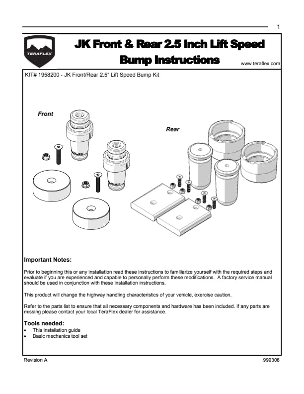Progressive Bump Stop Kit - Front (1.5 in. Lift) (# 1958150):, Front ?foam in. Progressive Bump Stops (1.5 in. Lift) - pair, 1.25" SpeedBump Bump Stop Strike Pad Kit - Front Lower (# 1467125), All necessary hardwareProgressive Bump Stop Kit - Rear (2.5-3.5 in. Lift) (# 1958252):, Rear ?foam in. Progressive Bump Stops (2.5-3.5 in. Lift) - pair, Rear Upper SpeedBump Bump Stop Cup Extension - pair, 0.75" SpeedBump Bump Stop Strike Pad Kit - Rear Lower (# 1954600), All necessary hardware |