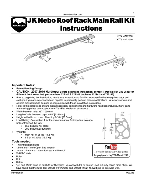 The purpose-built TeraFlex Nebo Roof Rack System increases cargo carrying capacity for your adventures. The main rail?s 10-series T-slot mounts readily accept accessory mounting hardware to mount additional gear.