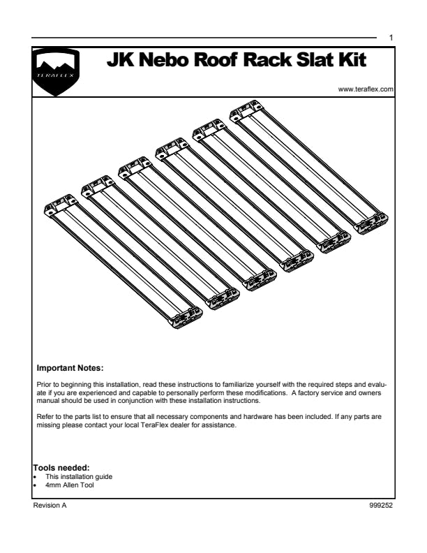 The 6-Piece Cargo Slat Kit provides a platform to hold gear and allows direct mounting of popular sport equipment carriers without requiring the use of a load or cross bar. This cargo slat kit must be used with the JK 4dr: Nebo Roof Rack Main Rail Kit. The purpose-built TeraFlex JK 4dr: Nebo Roof Rack System incorporates OEM aesthetics and styling with rugged performance to increase cargo carrying capacity for your adventures. The factory finished appearance makes it look at home in the city or on a fully loaded rig off road. The low-profile streamlined design has been tuned to reduce air resistance and noise when unloaded. The Nebo Roof Rack Main Rail Kit features universal accessory mounting capability.